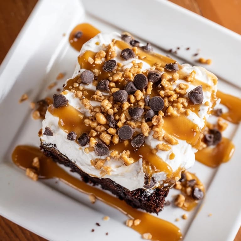 - Spread the thawed whipped topping evenly across the chilled cake like you're frosting it, then scatter toffee bits and chocolate chips generously over the top. Just before serving, drizzle that reserved caramel sauce across the surface in whatever pattern feels right.